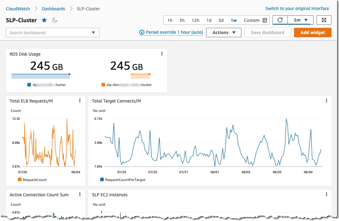 The easiest way to check the amount of storage being used by the nodes in the data cluster is to use CloudWatch. You can follow this AWS article on How To View Storage to view the volume sizes. For monthly reviews, add a Number widget for this metric to your main Cloudwatch dashboard.