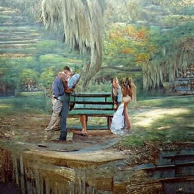 “The Kissing Bench Wedding Proposal” in the style of James Gurney