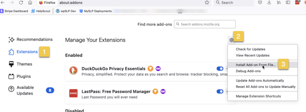 Go to the Setting Icon and choose “Install Add-on From File…”, pick the XPI file you downloaded.