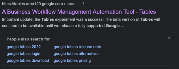 While there seems to have been a lot of attention on this project a year or two back, virtually all visible progress has gone to zero in the past 18 months. A dozen support cases have been submitted, ZERO have garnered any sort of response beyond the cookie cutter “we got your message” auto-bot. There have been no help article updates since mid-2021. There have been no version updates or other patches of features in at least the past 6 months. While Google published a “we are fast tracking this to become an official Google app” notice on Google Tables, it appears they may have list interest.