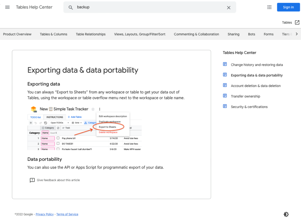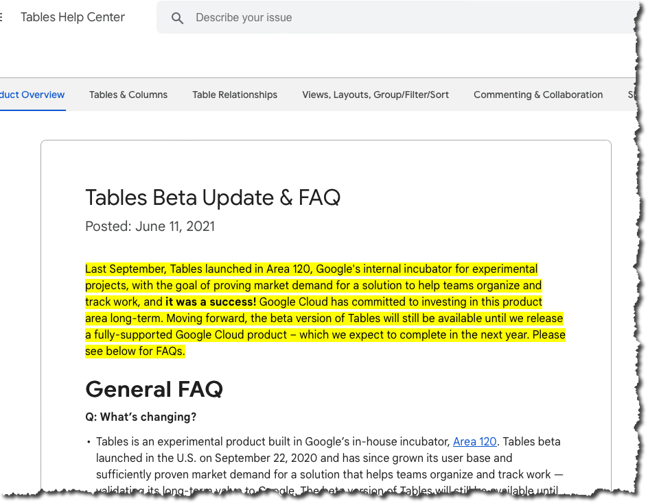 Overall — tons of potential but be wary of doing any long term heavy-lifting on Google Tables. At least until Google has a formal support ticket tracking system or other tangible help and support resources available. Especially if you are not good at doing regular “self backups” by exporting your tables to a downloadable format like CSV… there is no backup service for Google Tables at this point in time, and without a reliable support contact you’re on your own if stuff goes awry.