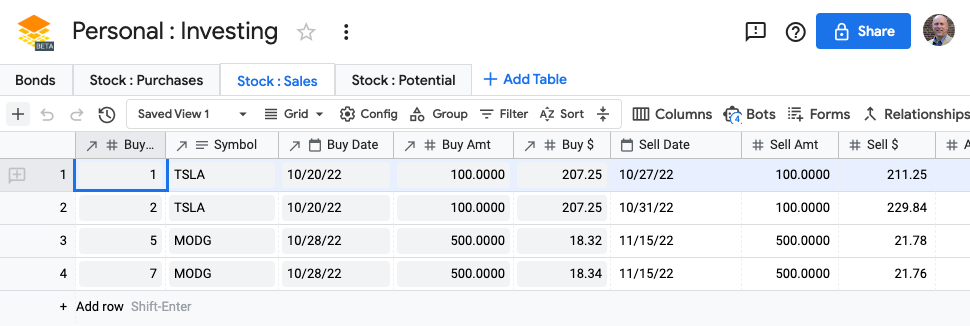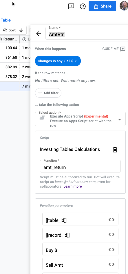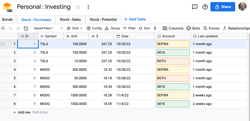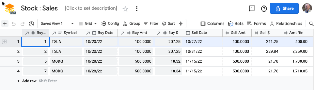 Getting a simple data tracking applet online that does basic math and updates other data tables or columns took minutes. Granted years of tech experience helped, but anyone with some experience interacting with online apps can figure it out without much effort. Here is a basic sheet that tracks stock trades.
