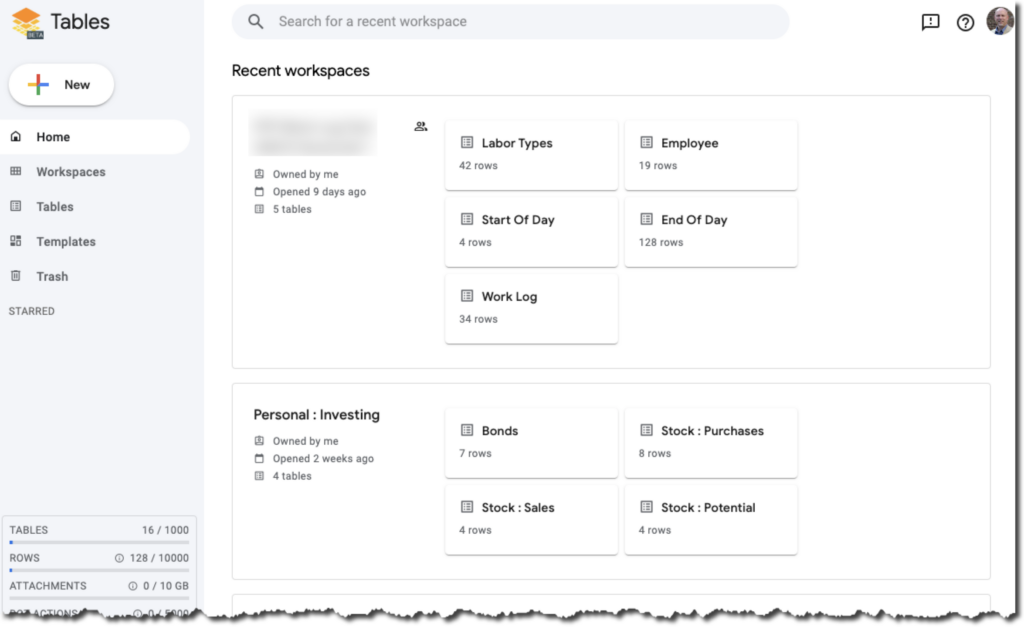 One feature I like is the idea of “Workspace” versus “Workbooks” with Google Tables. While it is very similar to spreadsheet workbooks, it is far easier to move tables (sheets in spreadsheets) to new Workspaces. In fact EVERY table (“sheet” in spreadsheet terms) actually resides in your Google Tables account as a separate entity. Workspaces appear to work much more like a grouping mechanism that is slightly more advanced than basic folders on your laptop OS or in a cloud storage service like Google Drive.