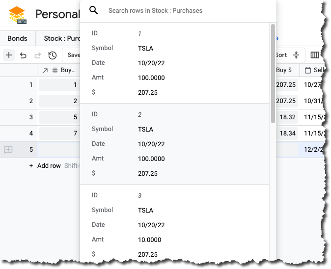 Here is what the lookup shows when double-clicking any of the lookup column. When you pick a purchase record all of the columns (Buy Lot # , Symbol, Buy Date, etc.) will auto-fill with the record from the purchases table.