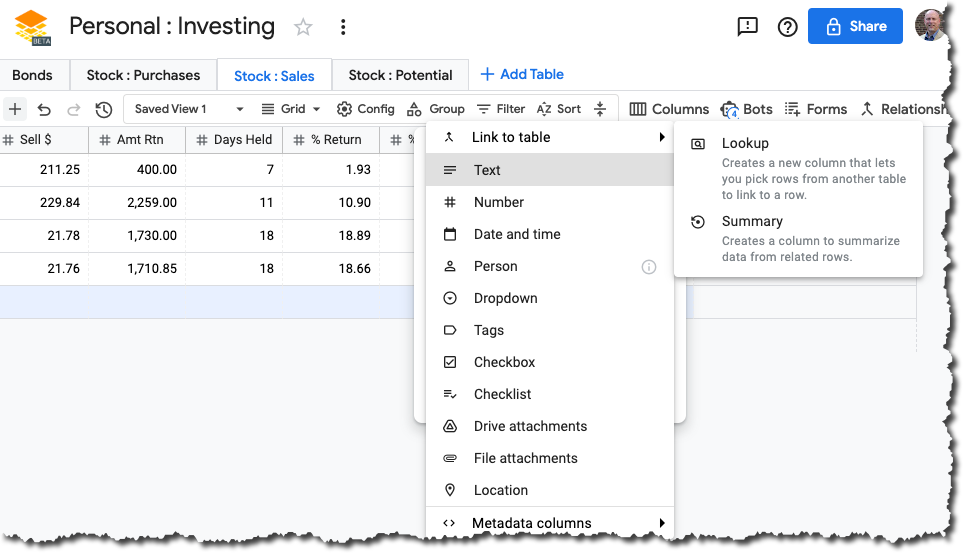 In this “Personal Investing” example , it is very easy to have the “Stock : Sales” table reference entries from the “Stock : Purchases” table so I can then calculate “per lot” gains or losses. You can even see a default “Relationships” button on the top right of the interface.