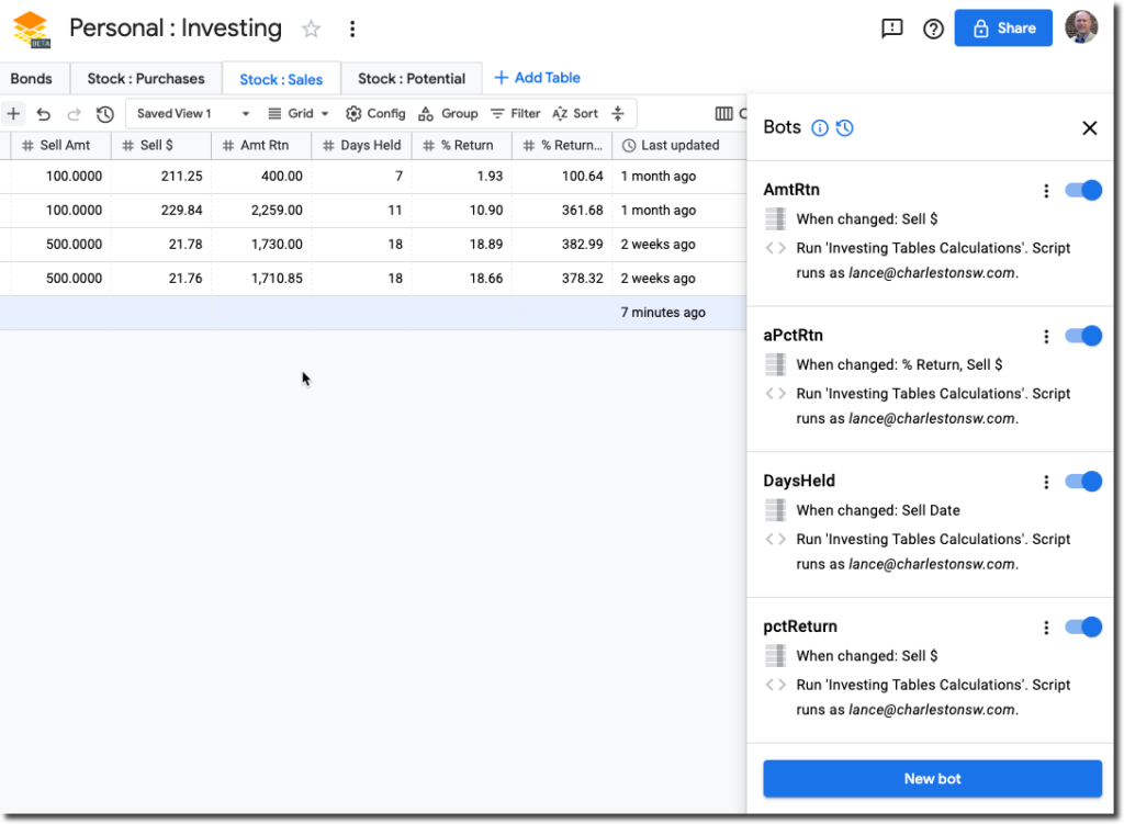 In the Personal : Investing example, a number of bots take the place of standard spreadsheet calculations. While a bit more work to setup than a typical spreadsheet formula, once you get the first Apps Script running the rest are very quick to implement. The trade off is that you get a full blow programming language, far beyond what even the most complex macros can do in a spreadsheet.