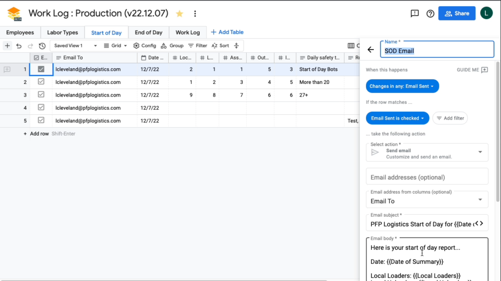 While the default bot does a great job, you’ll soon find that the simplest options presented by the built-in email bot may not suffice. For example, telling Google Tables to send an email whenever a row is added will leave you with emails going out with no data in the email body (it fires as soon as a row is added, not after you finish editing the data). You’ll also find that having the bot fire whenever a row is updated leads to similar problems, especially if you’ve found a data entry mistake after moving off the current row.