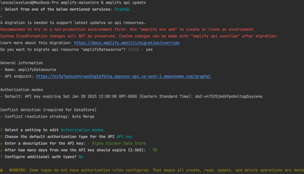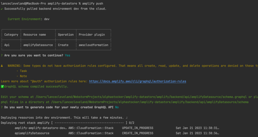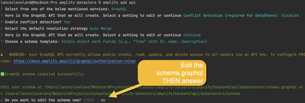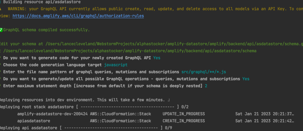 Edit your schema at /Users/lancecleveland/WebstormProjects/alphastocker/amplify-datastore/amplify/backend/api/amplifyDatasource/schema.graphql or place .graphql files in a directory at /Users/lancecleveland/WebstormProjects/alphastocker/amplify-datastore/amplify/backend/api/amplifyDatasource/schema