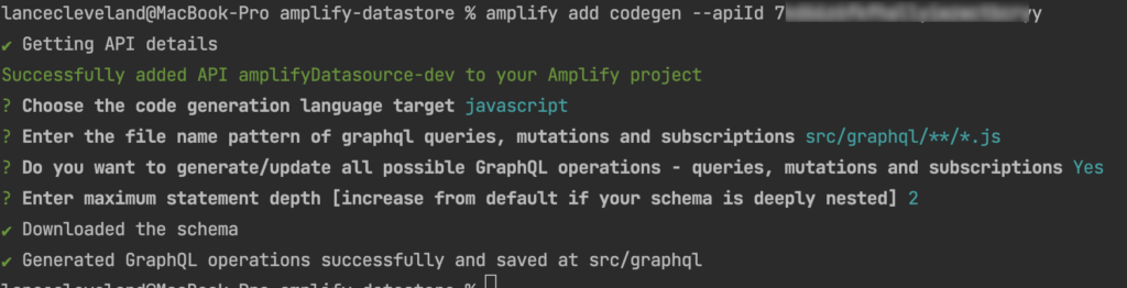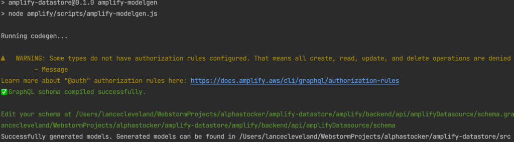 Successfully generated models. Generated models can be found in /Users/lancecleveland/WebstormProjects/alphastocker/amplify-datastore/src