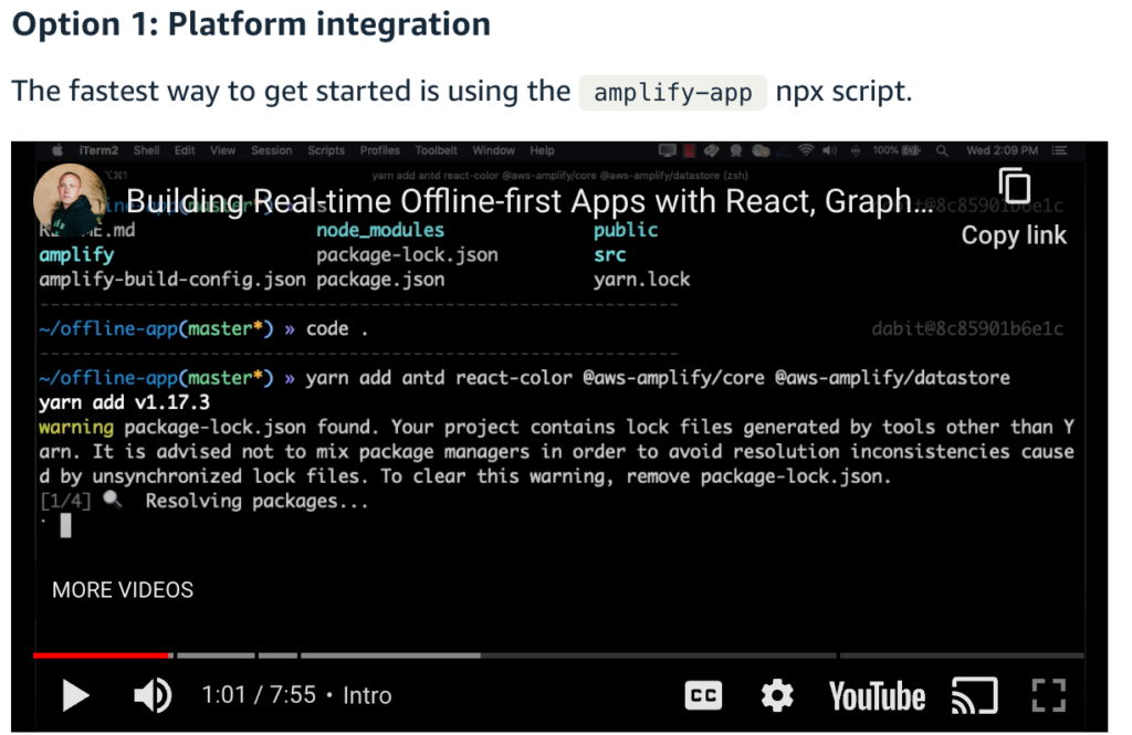 If you follow the Amazon Getting Started guide you’ll note they suddenly change to Yarn for node management and get Ant Design involved as their preferred UX framework for the React app.