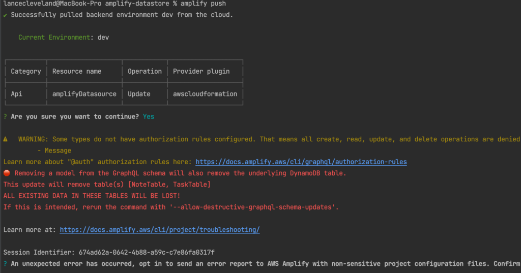 The model gen worked and the push looked promising, but alas no… it broke. It did indicate it needed to remove the old ToDo model tables, but clearly it did not like deleting all the tables and putting in a new one:
