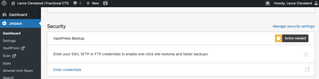 Once the WordPress instance is up-and-running and you have your SSL certificates and domain pointers configured, it is often prudent to enhance security and stability by implementing Jetpack. Most of the process goes fairly smoothly, however with the curent Bitnami images running WordPress 6.x there is an issue connecting Jetpack’s backup restoration connectors.