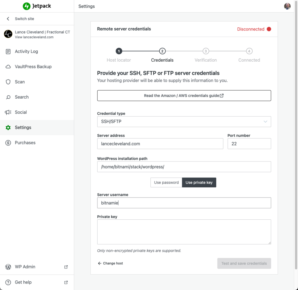 When you follow the Enter credentials link it brings you to the Jetpack “cloud dashboard” where you manage the connections to all your sites. It will ask for your host and should indicate AWS is the best-guess.