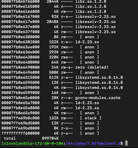 In our example server from the cluster , a web-app specific node, there is 16GB available of which 1GB is consumed by various server processes, 500MB of high speed local cache, and another 500M used by PHP and related shared code. That leaves 14G for PHP apps which are averaging 16M/process. Each node can handle around 800 simultaneous web requests or PHP-FPM children