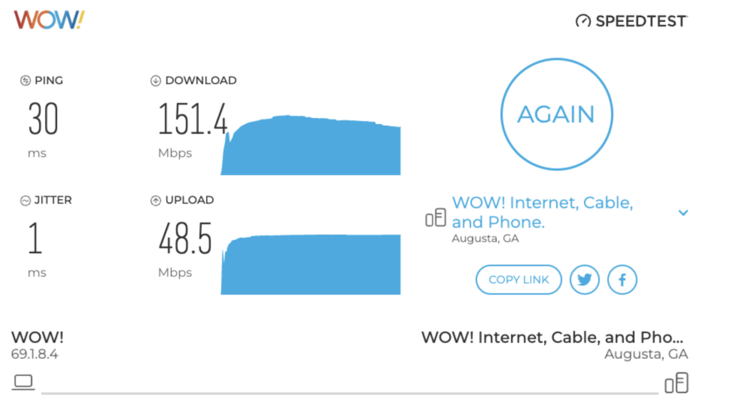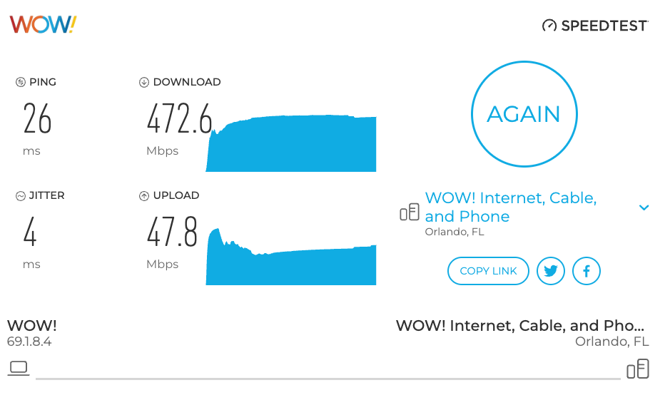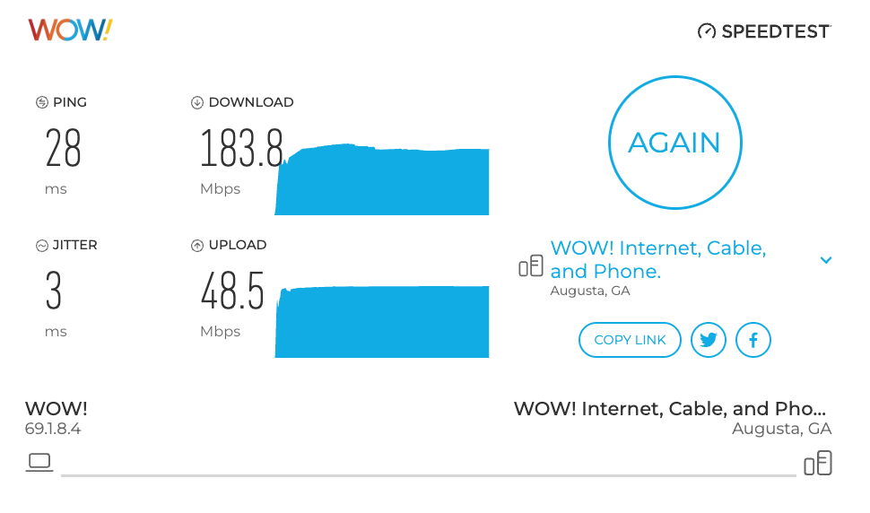 For the past few weeks the Internet speed at the home office has been extremely inconsistent. The rated speed from WoW! is supposed to be 500 Mbps down / 50 Mbps up. My speed for much of the morning, and most of the past month, had varied from 120Mbps / 47Mbps to as low as 20Mbps / 0.9 Mbps (just this morning) and usually settled around 42 Mbps / 47 Mbps most days. Latency (ping) ran an average of 50ms with it getting as fast as 26ms.