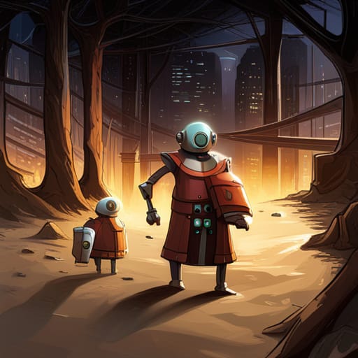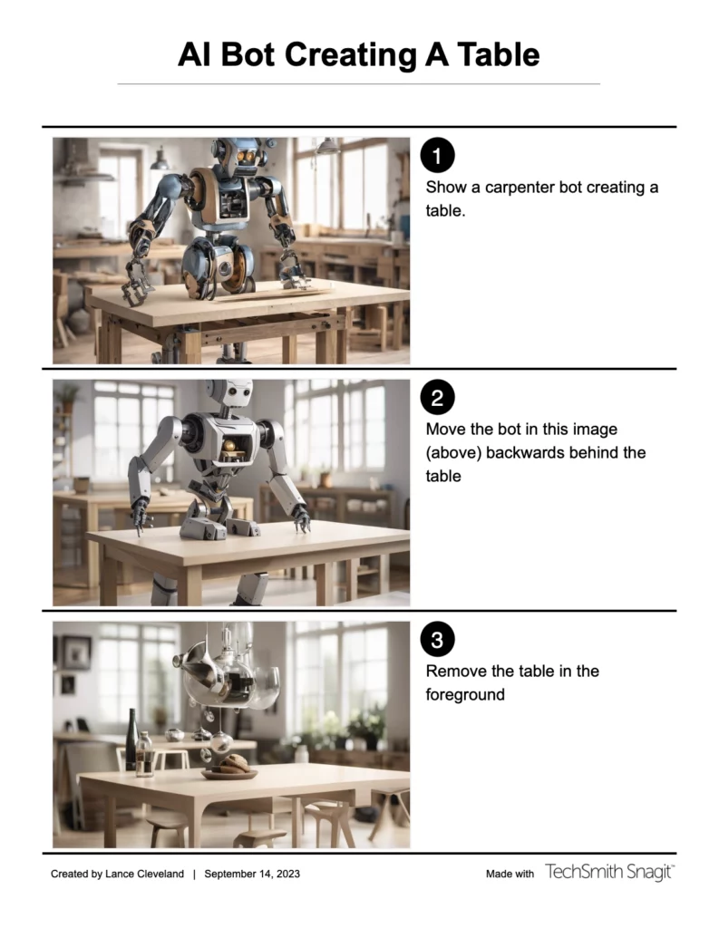 And to that point, a human would very likely have NEVER create the initial image of a bot standing IN the middle of a table as if it was part of some horrific Star Trek Teleporter accident. Humans, unlike Art AI algorithms have something called life experience. They incorporate that into their creations and rarely, unless as a deliberate act, create something with humans (or human-like android bots) bifurcated by a dining table.
