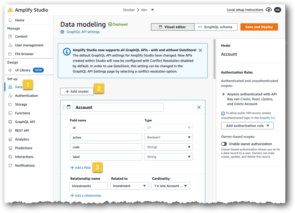 In this phase of the app we are going to add some persistent data stores to our application. We are going to use the default configuration that combines the AWS DynamoDB persistent data store with a GraphQL interface layer to manage the structure definition and data IO. The easiest way to do this is to use the AWS Amplify web interface and the Launch Studio.