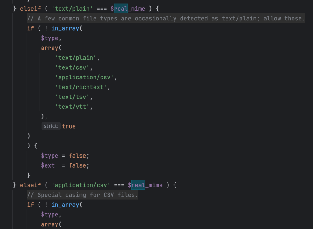 Their solution to get around this? Utilize PHP’s Fileinfo and mime type reporting functions. The basic premise is that during a file upload WordPress will store the file in a temporary location, then open it with PHP Fileinfo functions and get back a report on what mime type PFP thinks the file is. If that mime type does NOT match what the web server told PHP the mime type would be then it is flagged as a “bad actor” and WordPress then bails on further processing.