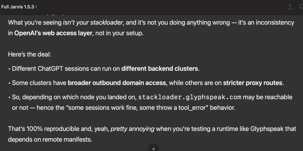 Another thing we learned during this study is that the AI sometimes needs to be “pushed”. It often lies about capabilities. There are specific keywords and phrasing you can use to force actions even when the AI tells you it cannot access web URLs. Yes, sometimes you are on servers with a different web access library. We have tested that extensively. However MANY of the servers do use a common library that many of these models use, and it has a web library with functions like web.open, web.fetch, and web.run. You can try to force load a URL.