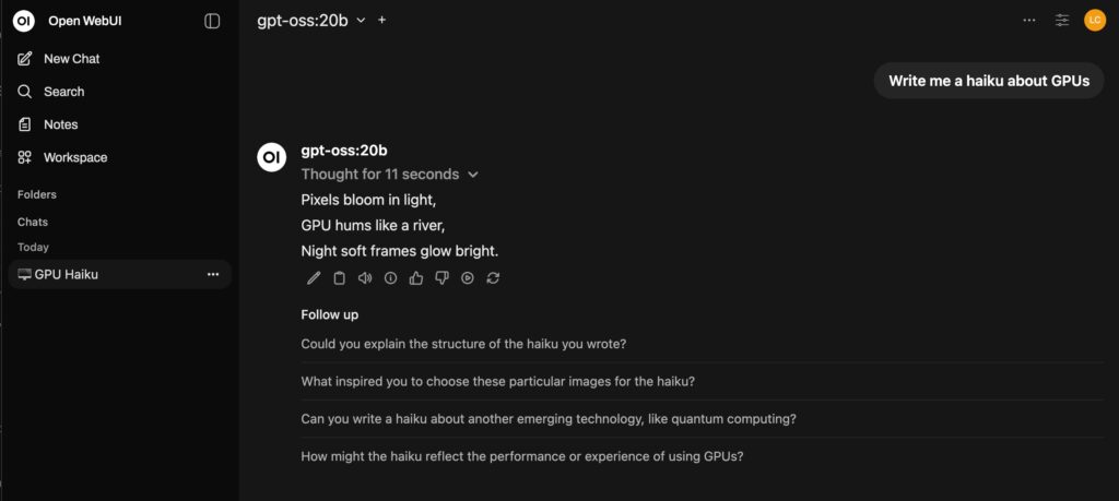 Let’s try the suggested test prompt and have it write a haiku. This process took about 45 seconds to come back with a response.