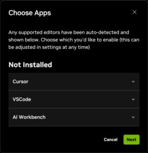 After downloading and installing the Sync app, running the app for the first time will walk you through the setup process. Out of the box the NVIDIA DGX Spark clearly has a preference for specific code editors – Anysphere Cursor, Microsoft VSCode, or NVIDIA AI Workbench. I’ve been using the Jetbrains family of IDEs for a while, but they are a bit of an outlier these days. Guess I’ll need to investigate more mainstream tools like VSCode or Cursor as yet one more system nudges me in that direction, though the NVIDIA option is intriguing since we are working with their hardware. I think I’ll start there and see where it leads me.