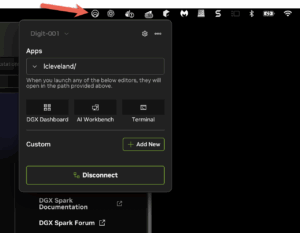 One thing that threw me off after getting the Spark added to the Sync app was the complete lack of visual feedback. I closed all NVIDIA apps, reopened Sync. Nothing. Turns out the app added itself to the MacOS icon bar on my system instead of using a typical toolbar app icon for access. No problem, click the icon and get started talking to the DGX Spark.