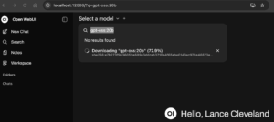The Open WebUI interface provides a link to download the model from within the UX. That is NOT something a commercial agent like Claude or ChatGPT will offer as they want you to be using THEIR trained models. Here it is downloading the gpt-oss:20b model over the 740Mbps connection, total time looks like it should take a little less than 5 minutes to download.