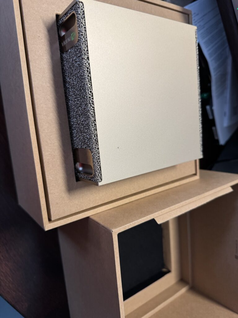 The DGX Spark arrived in a small cardboard box that very much follows the Apple-inspired design – virtually no plastic, a nice cardboard insert with everything neatly packaged and presented in a minimalistic format.
