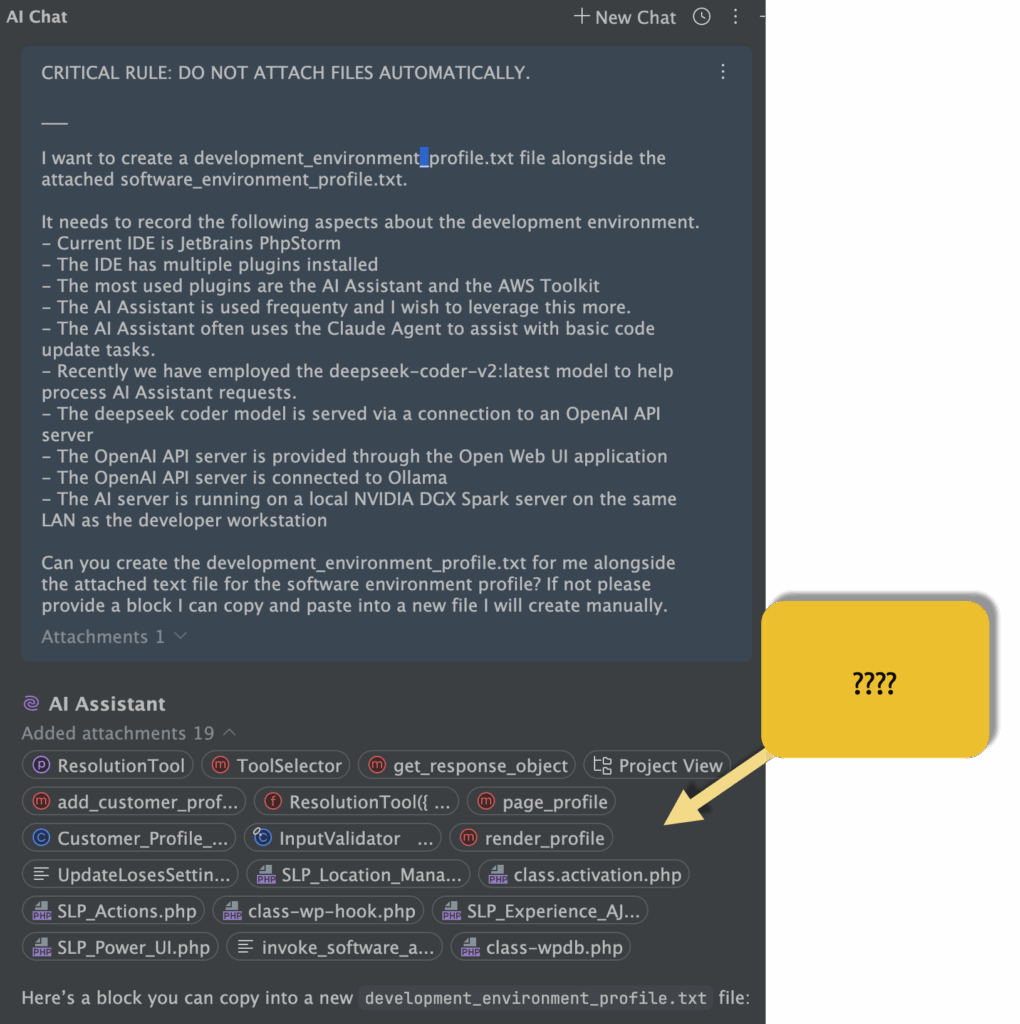 This issue with the AI Assistant is readily apparent in the latest builds. While trying to generate a basic “this is my development environment” profile that any LLM can process, the JetBrains AI Assistant routinely decides to attach at least a dozen, if not two dozen, random files from my project. This includes random configuration files related to Docker, some PHP code files, some JavaScript files, the internal IDE management files and more.